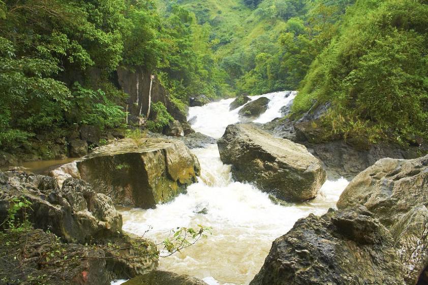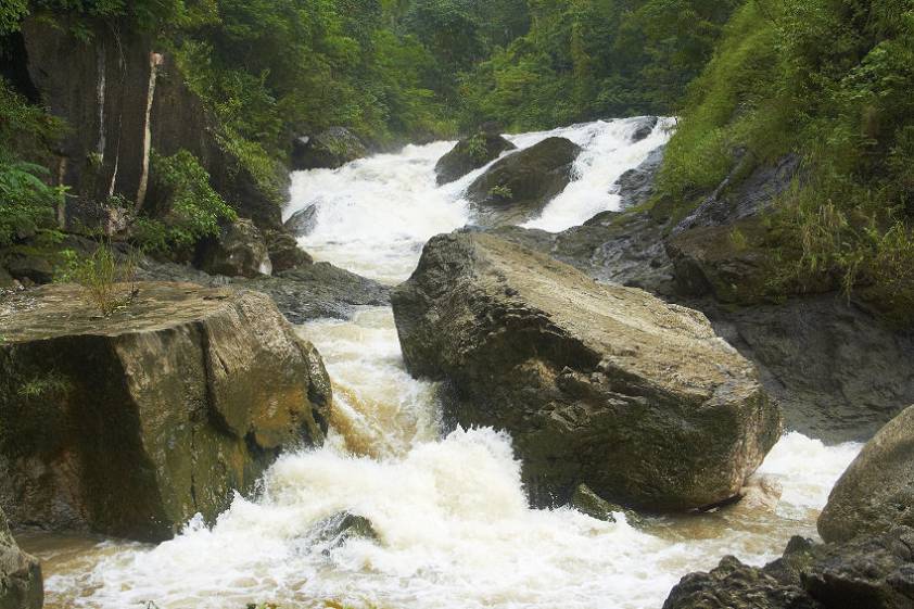 Вход найдет, гид убежала играть в куклы, а мне навстречу идет целая группа филиппинцев. Оказывается, они не дошли до водопада, повернув обратно. Дело в том, что за последние дни выпало очень много осадков и поток воды в ручье стал настолько мощен, что пройти к водопаду не представляется возможным. Они смогли пройти буквально метров десять и решили возвращаться. Советовали возвращаться и мне. Ну да, думаю, вам то из соседних городов к этому водопаду не проблема вернуться в любой день, а мне вот из России путь не близкий. Филиппинцы уходят, я остаюсь наедине с многовековыми валунами, разбросанными по бурлящему ручью.