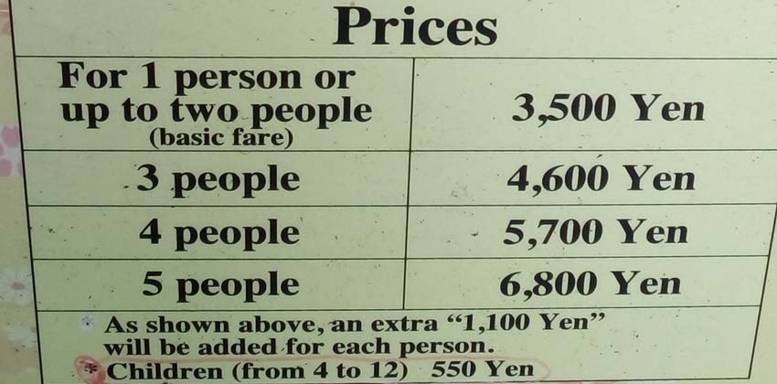Спустившись от обезьян, вы можете заказать небольшой тур на лодке. Сама поездка занимает минут 40, лодка относительно небольшая, на 10-12 человек. Лодка не на моторе, а управляется веслами местным жителем. Даже не знаю, рекомендовать это развлечение или нет. Если вы плывете группой, цена снижается и тогда есть смысл. Многое вы не посмотрите, но для разнообразия пойдет. Может в ноябре, когда цветут клены или в марте, когда цветет сакура, эта прогулка будет очень даже в тему. Ниже вы можете видеть расценки, в зависимости от количества человек.