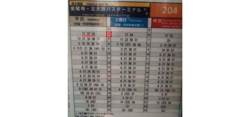 Обратите внимание, расписание не совсем привычное для нашего глаза. Колонка справа это час (обведено в квадрат), а слева указаны минуты (подчеркнуто красным). Подчеркнутые цифры в данном случае значат, что автобус прибудет в 06.17, 06.37, 06.55. Кому как, мне автобусами реально было проще добираться до некоторых достопримечательностей Киото.