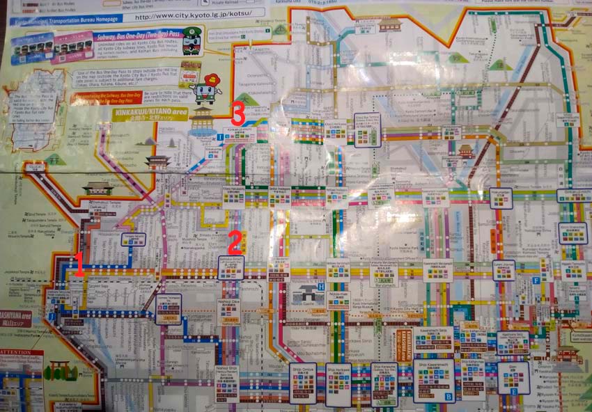 Мне же показалось, что до большинства мест в Киото удобно добираться на автобусе. Ниже вы можете видеть карту автобусного сообщения в Киото. Поначалу кажется, что лучше с этим не связываться, но немного разобравшись, все становится довольно просто. Давайте на примере разберемся как пользоваться автобусами в Киото. Условно, доберемся от Арашиямы (номер 1 на на карте) до золотого храма Kinkaku-ji (номер 3 на карте).