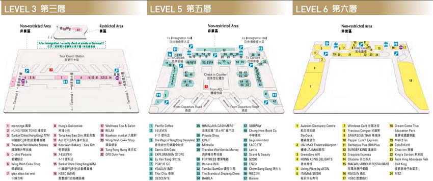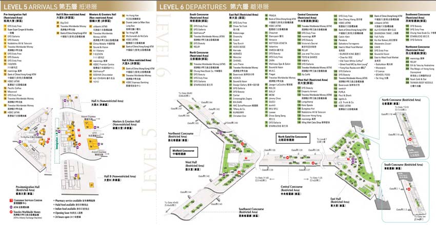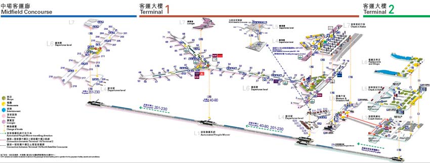 На скриншотах ниже можно видеть подробную схему аэропорта Гонконга (терминал 1 и терминал 2). Скриншоты 2 и 3 можно скачать в формате PDF здесь.