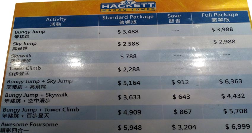 В конце статьи вы можете посмотреть видео прыжка с башни в Макао, но перед этим несколько слов о расценках. Прыгнуть с тв башни в Макао удовольствие не из дешевых. Сам прыжок с видео и фото съемкой обойдется примерно в 4000 гонконгских долларов, что немногим меньше 4000 юаней. Если без съемки, цена будет на 500 долларов ниже, но видео сделано очень качественно и на мой взгляд, стоит за него заплатить. Ниже вы можете видеть расценки. Как видите, есть много различных опций, но все же главная, сам прыжок. Ни разу не пожалел о потраченных деньгах. Ощущения просто не передать словами. Лучше самому ехать и пробовать.