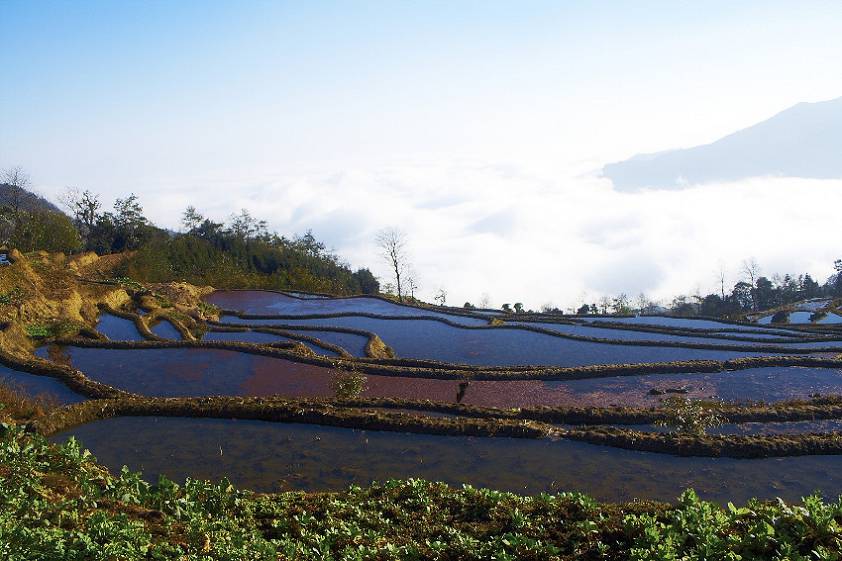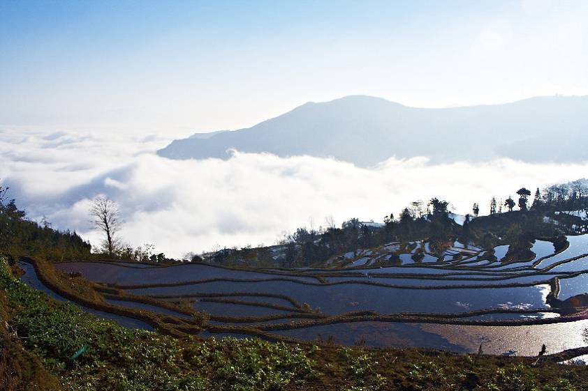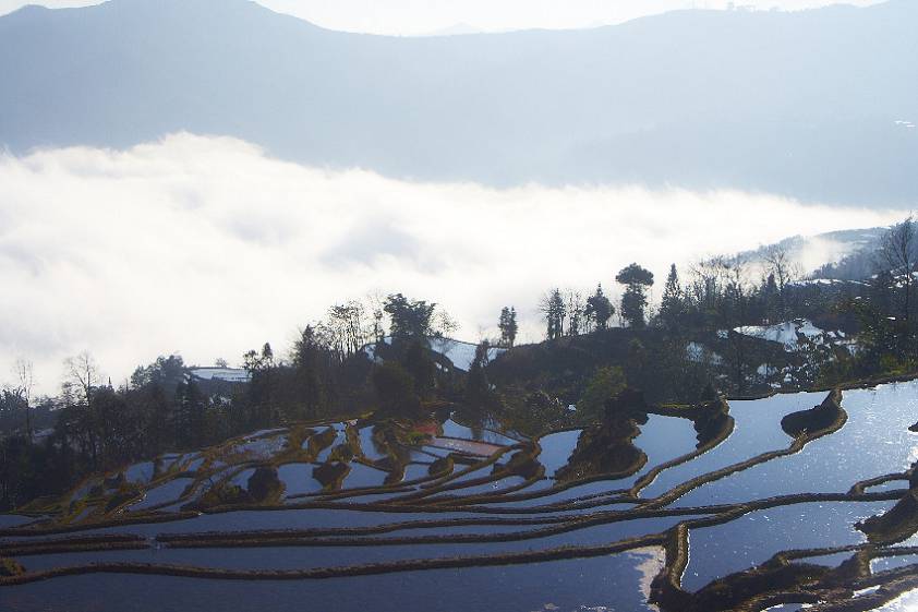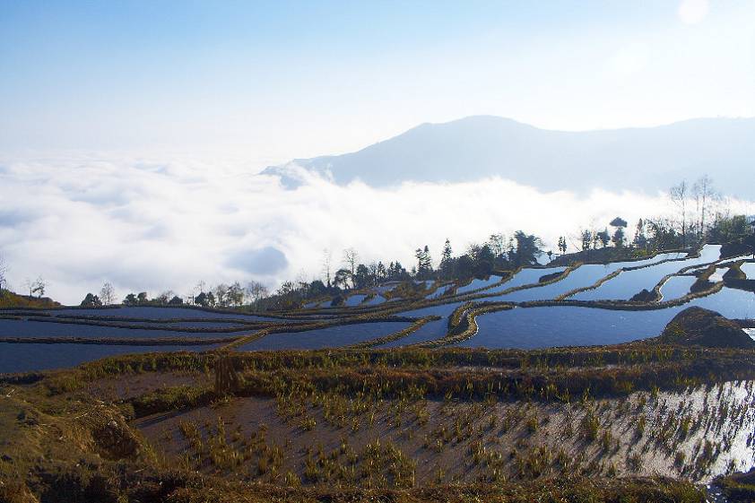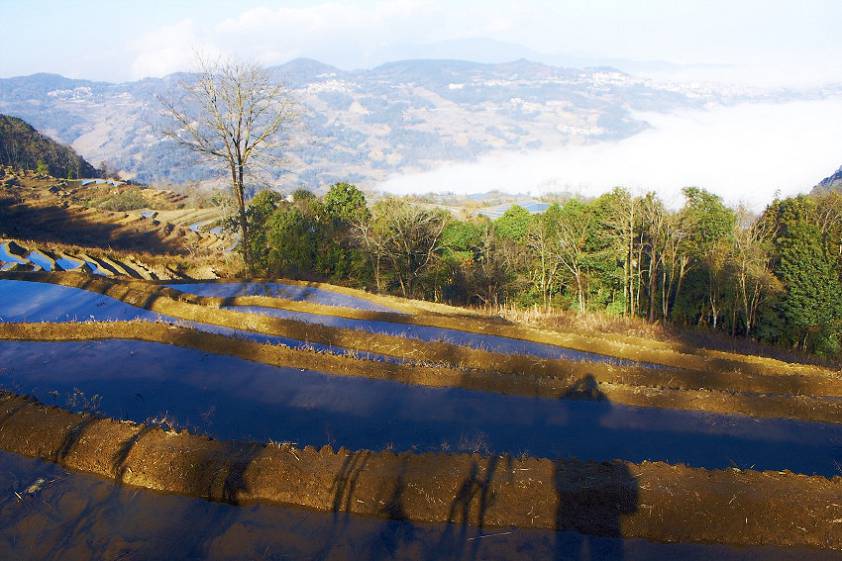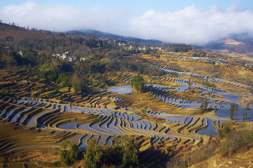 Рисовые террасы в провинции Юньнань, что на юге Китая, довольно популярная достопримечательность Китая, широко разрекламированная путеводителем Lonely Planet. Круглый год здесь можно найти любителей прекрасных фотографий из самых разных уголков планеты. Именно зимние месяцы считаются наиболее привлекательными, поскольку рисовые террасы в это время года наполнены водой и порой отражение облаков, украшенные солнечными лучами закатов и рассветов, создают ни с чем не сравнимую картину.