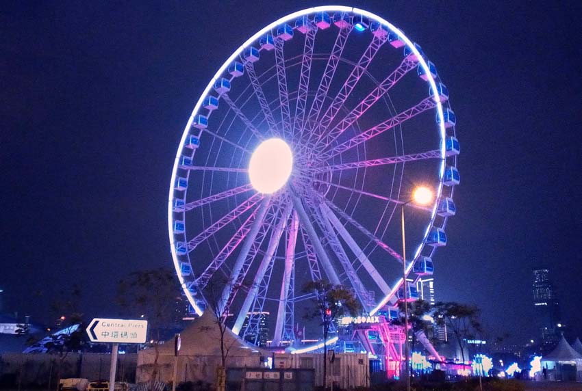 Обычно подобного рода достопримечательности выглядят массивно и величественно, но на фоне небоскребов Гонконга, колесо обозрения кажется совсем крохотным. Не заметил, чтобы оно пользовалось большим спросом, тем более что в Гонконге хватает бесплатных панорамных точек, вроде Пика Виктория или обзорной площадки в Central Plaza.