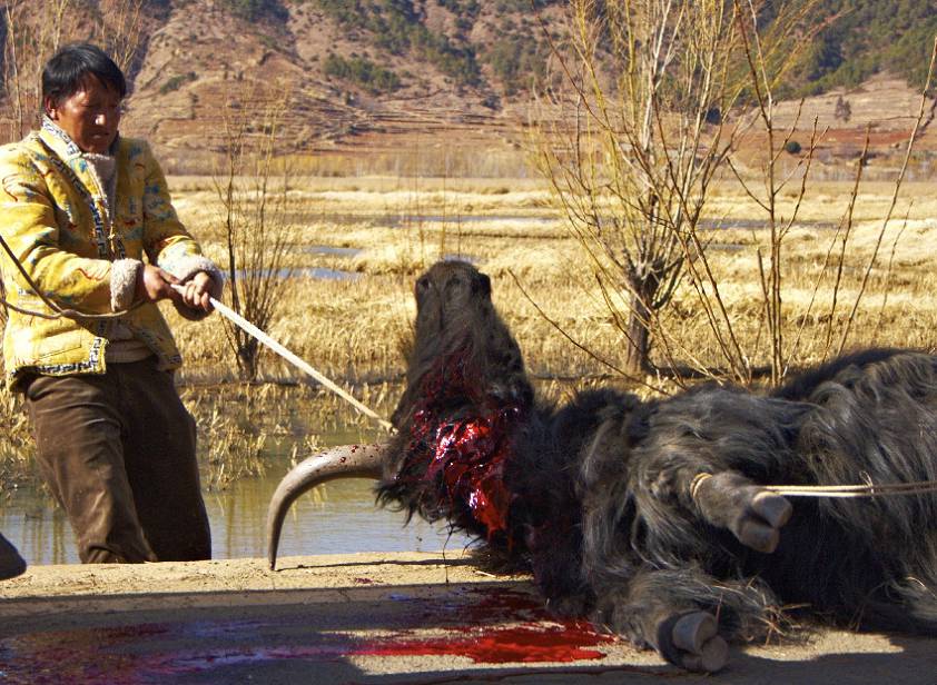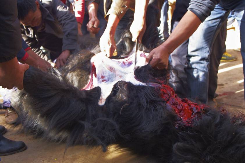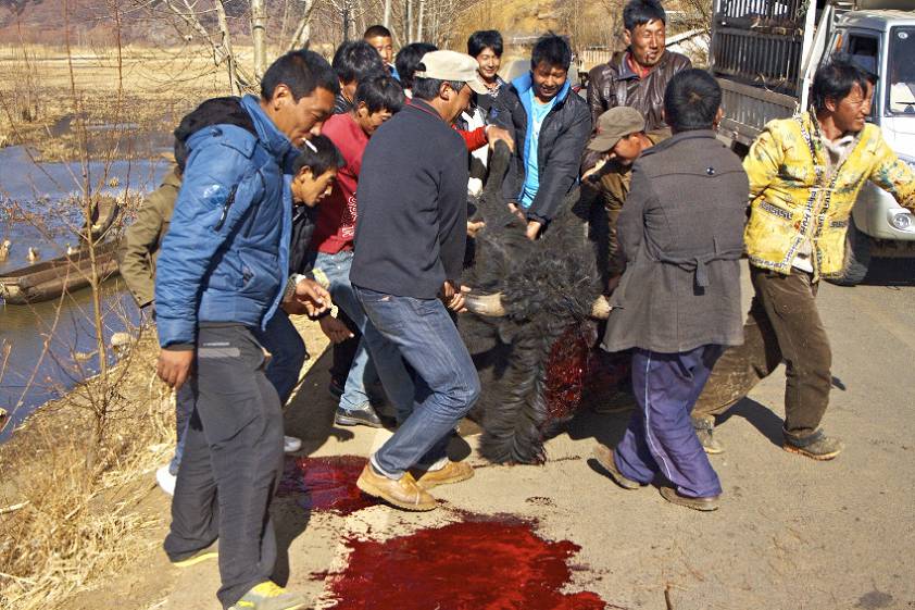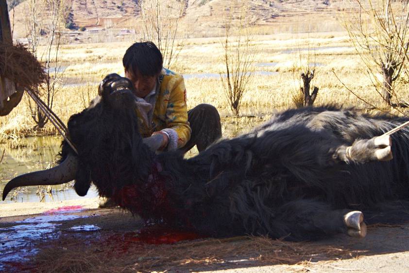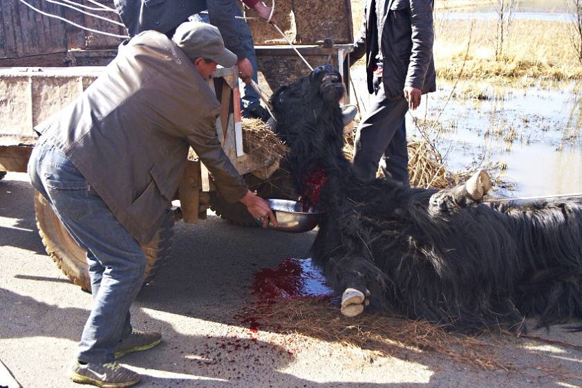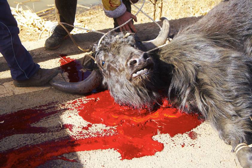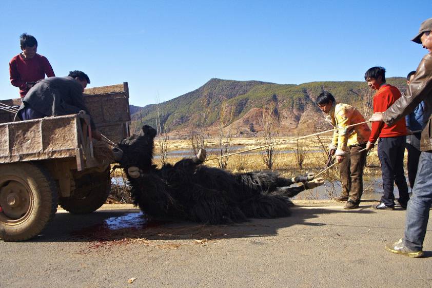 Так бы и прошел день в неспешной езде, если бы не один прелюбопытный момент. Примерно на пол дороги мы стали свидетелями того, как по заведенной местными жителями традиции, перед китайским Новым Годом забивают быка. Если вы не любители казней животных или лужи крови, пролистайте дальше. Тем, кто любит кровяку на асфальте, будет интересно. Не подумайте, сам не любитель живодерства, но упустить такой момент просто не мог.
