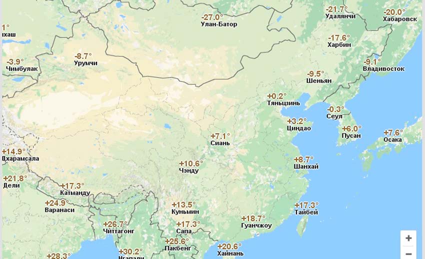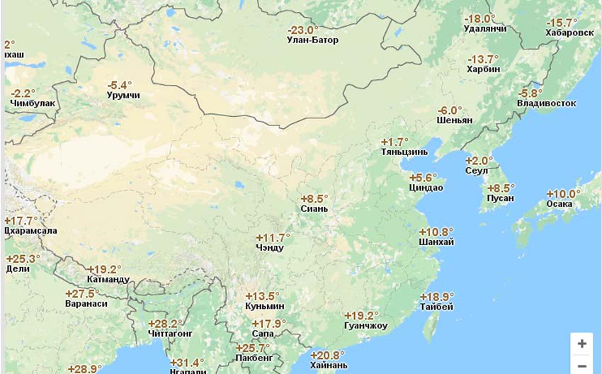 Как видно из карты погоды, в январе в Китае на севере, температура воздуха держится около отметки -20 градусов, тогда как на юге, на острове Хайнань, вы можете ходить в футболке, поскольку на улице 20 градусов выше нуля.