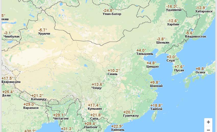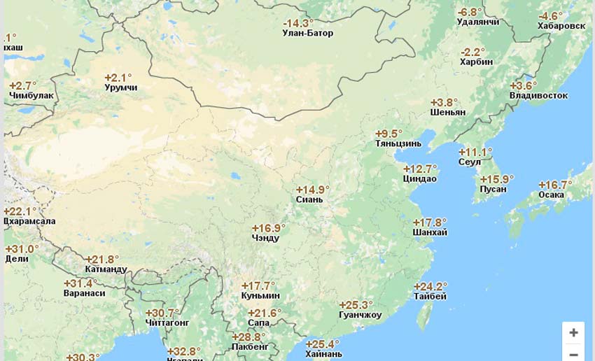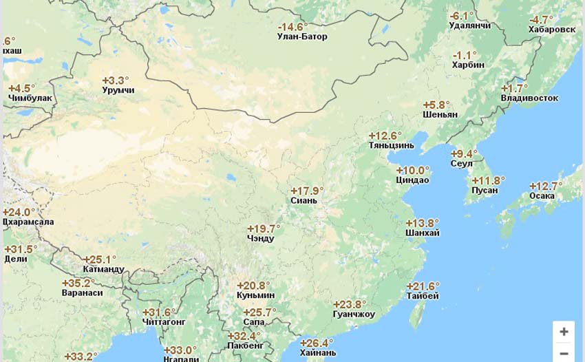 Как вы понимаете, погода в Китае сильно отличается, будь то юг страны или север. В сегодняшнем обзоре погоды Китая попробуем выделить нечто среднее по каждому месяцу в отдельности. Узнаем, какая погода по месяцам в Китае на севере страны, в центральной части, а также на юге. Под обзором каждого месяца вы можете видеть изображения карты погоды в Китае, показывающие средние показатели в разных городах. Данный обзор, часть объемного путеводителя по Китаю.