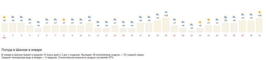 Если вы прилетели в Шанхай в январе, стоит ожидать температуру примерно в 7-9 градусов тепла, с не очень высокой влажностью. Как правило, в январе в Шанхае пасмурных дней больше, нежели ясных. Это не делает январь лучшим месяцем для посещения мегаполиса.