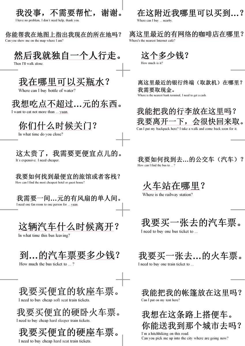 Два года назад, во время своего первого путешествия по Китаю, использовал один метод, который очень облегчал мне жизнь. Придя на очередной вокзал, показывал распечатанные заранее таблички на китайском с полезными фразами. Работало на ура.