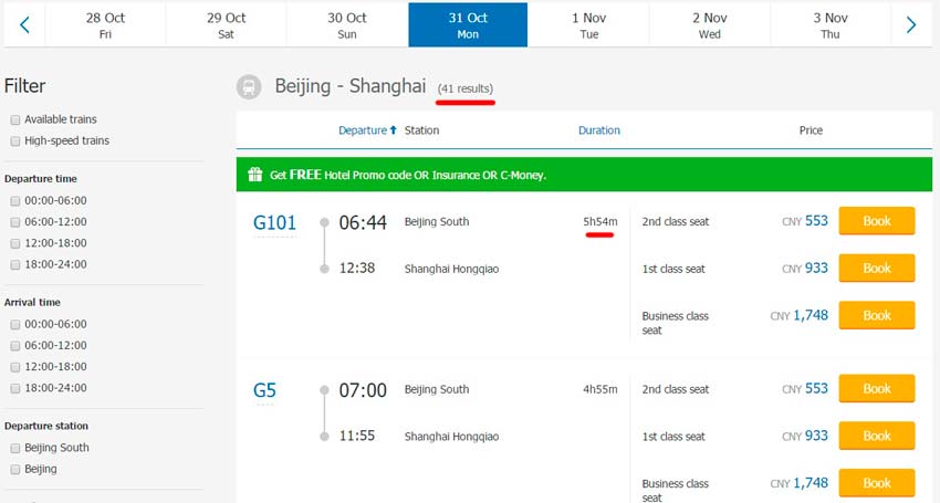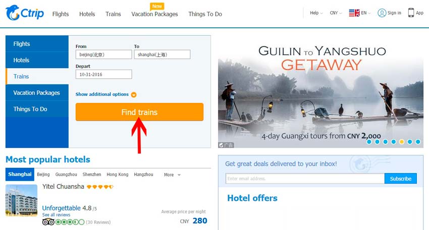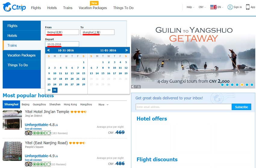 Скайсканнер, сервис полезный, но для перемещений непосредственно внутри страны, более подходящий - ctrip.com. Здесь вы можете забронировать билеты как на самолет, так и на поезд. Как бронировать авиабилеты на внутренние рейсы Китая рассказывал в статье про китайские авиалинии. Но есть смысл подробнее остановиться на бронировании и покупке билета на поезд.
