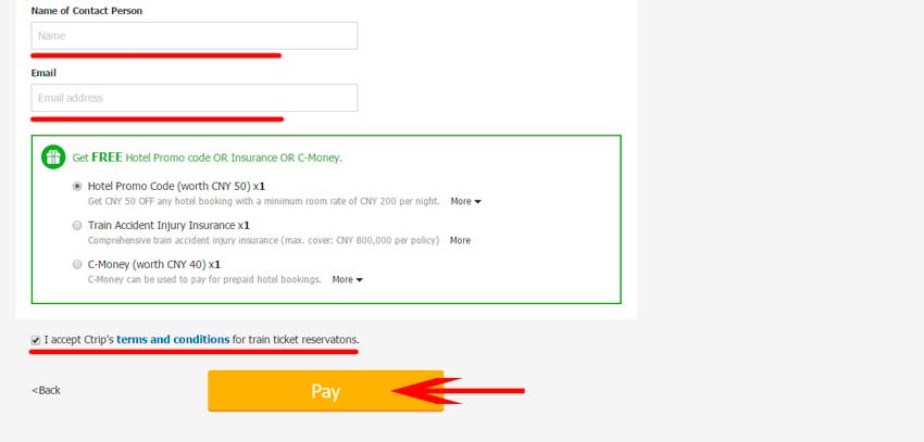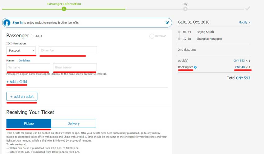 Если планируется покупка сразу нескольких билетов, можно добавить контактные данные взрослых и детей, нажав на соответствующие кнопки (add an adult/Add a child). Ниже нам предлагают выбрать способ доставки электронного билета. Если нет формального адреса в Китае, вариант с доставкой (Delivery) нам не подходит. Выбираем вариант отправки купленного билета на поезд на e-mail (Pickup). Указываем имя и контактный email. Соглашаемся с условиями и жмем оплатить (Pay).