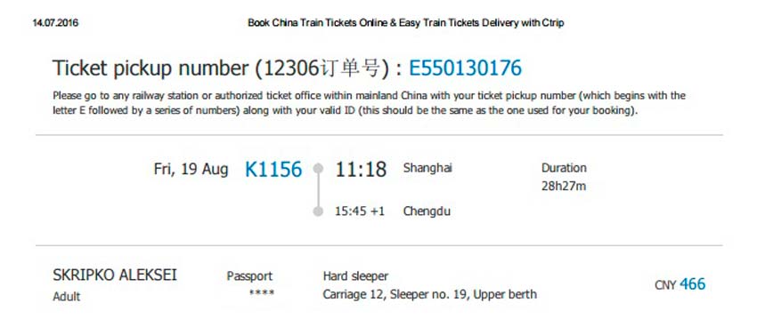 Важно! Это лишь подтверждение, сам билет вам необходимо будет получить непосредственно на вокзале. Вместе с паспортом пассажира, на которого оформлялся билет и подтверждением брони (распечатанном или сохраненном на мобильном устройстве), вы заранее приходите на вокзал и встаете в очередь, где продаются билеты. Показываете паспорт, подтверждение и только после этого получаете билет на поезд. Лучше приехать заранее. Скажем, процедура получения билета на поезд в Шанхае заняла у меня около часа.