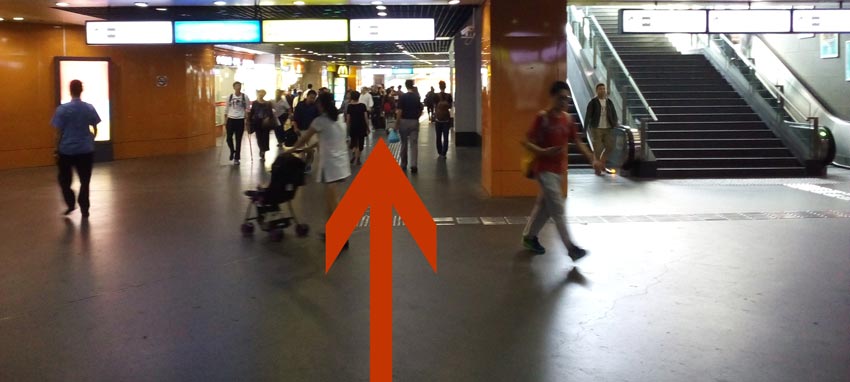 Поднимаемся по лестнице, перед нами эскалатор на второй этаж, слева тоннель с указателями. Нам нужен тоннель, по окончании которого, выход на улицу.