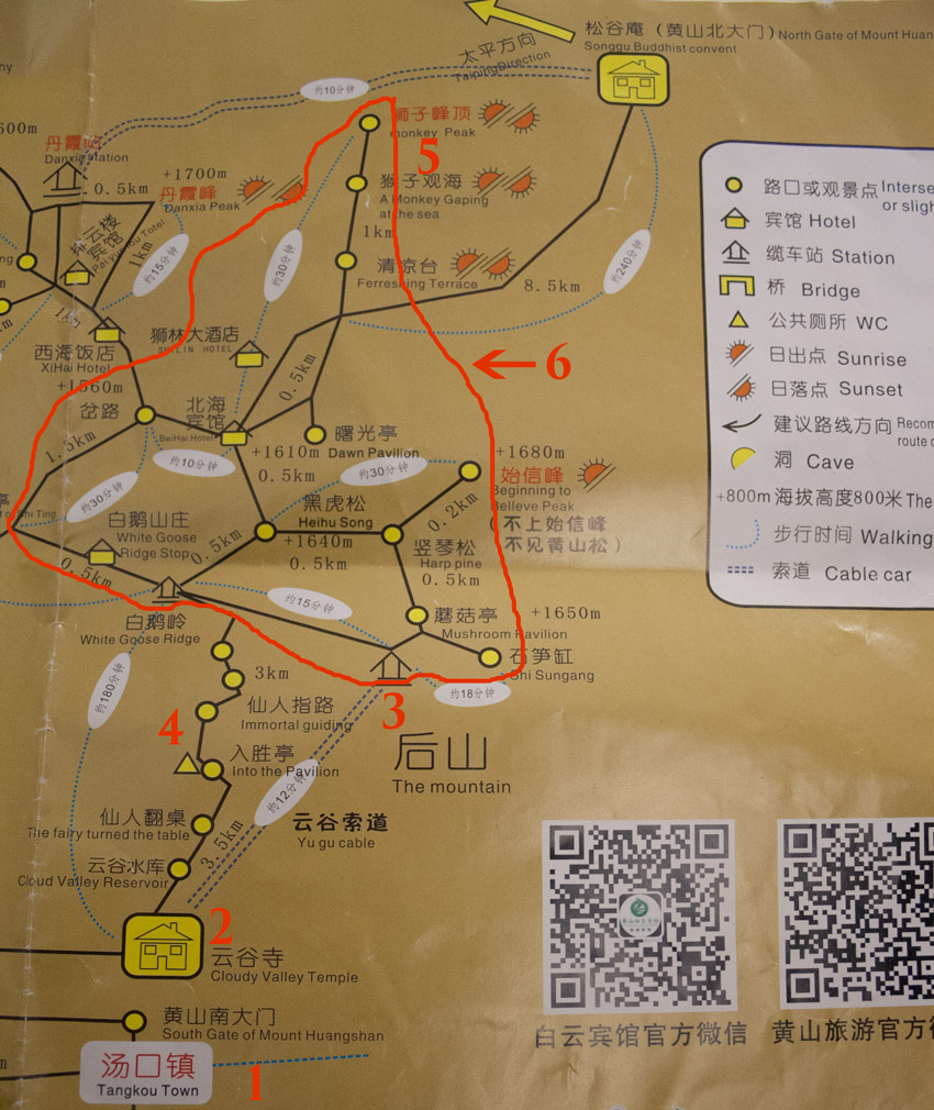 Сразу уточню, что мой маршрут был рассчитан на два полных дня, ночевку на горе и последующий отъезд вечером второго дня в Тунси. Ниже расскажу про свой маршрут на два дня, который мне видится оптимальным. Остальные маршруты сделаны на глаз, исходя из того, сколько по времени заняло прохождение того или иного участка парка Хуаншань.