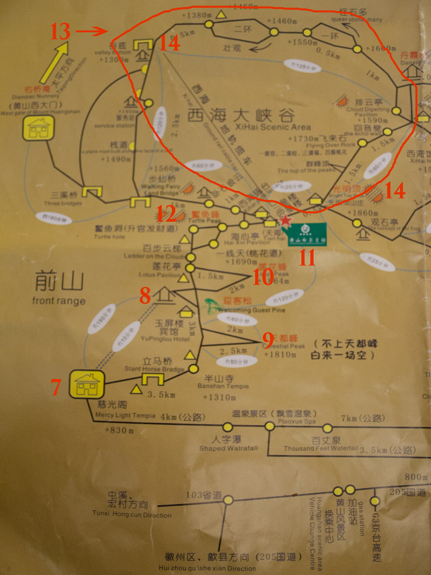Время около пяти вечера, канатка доставила вас к отелю Байюн, самое время идти смотреть закат. Закат на горе Хуаншань разнится от времени года, точное время лучше узнать в отеле. Скажем, в октябре, солнце садится примерно в 17.40. К этому времени все толпы китайцев несутся на Bright Top Peak (обозначено на карте). Хотя это место не самое лучшее, чтобы увидеть закат, но это очень по-китайски. Бежать туда куда все бегут.