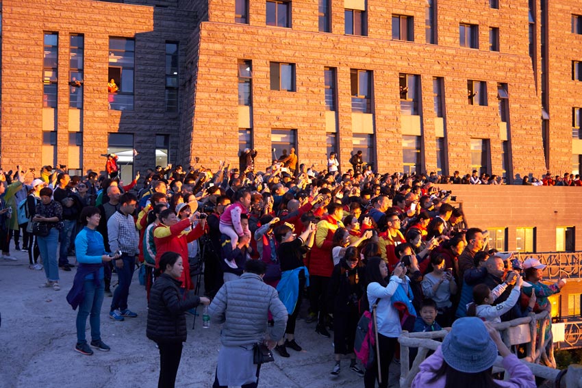 Если вы не прочь встать в 5 утра, чтобы посмотреть рассвет, обзорная площадка находится также примерно в 15 минутах от отеля Байюн. Нужно подняться по лестнице до Bright Top Peak, а там не заблудитесь, толпы китайцев покажут вам направление. Будьте готовы, что придется ловить фотографии рассвета, толкаясь локтями с другими любителями раннего подъема. Ниже вы можете видеть лишь часть из них. Но мне показали другую обзорную точку, которая без единого человека. Нужно перелазить через ограду и немного карабкаться. Вероятно, в следующий раз ее испробую.