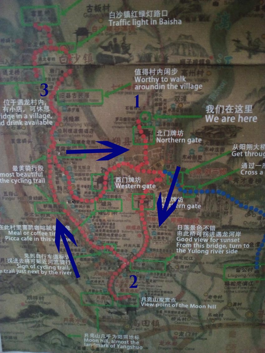 Хостел Yangshuo Sudder Street Guesthouse. Отсюда начинается маршрут на велосипедах. Стрелкой указано, в каком направлении ехать.